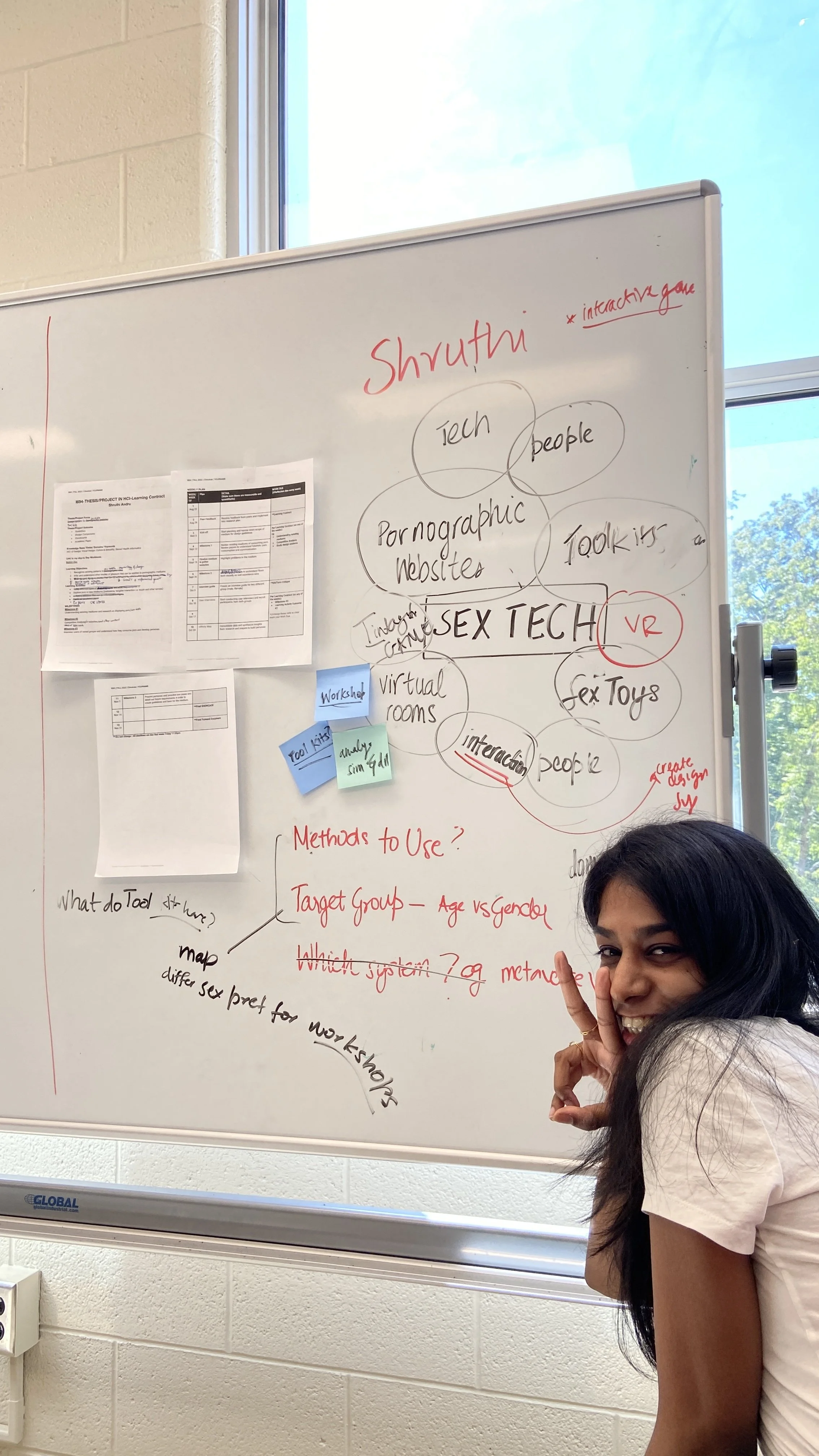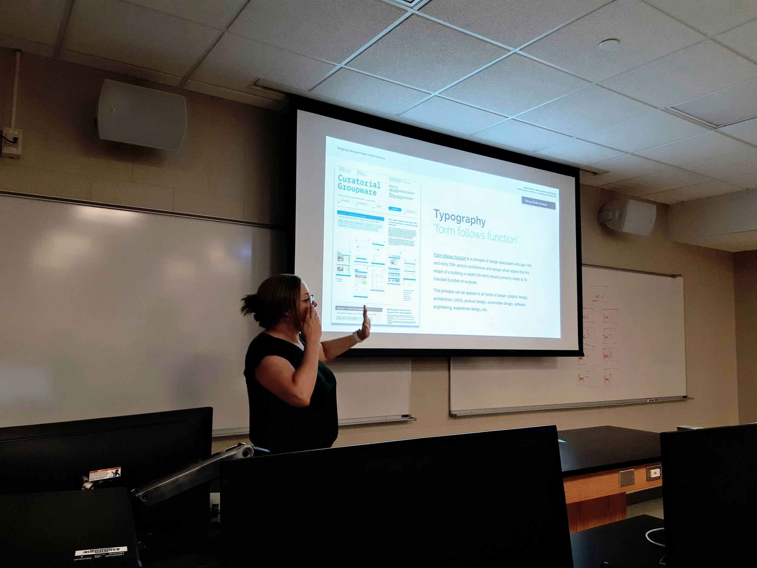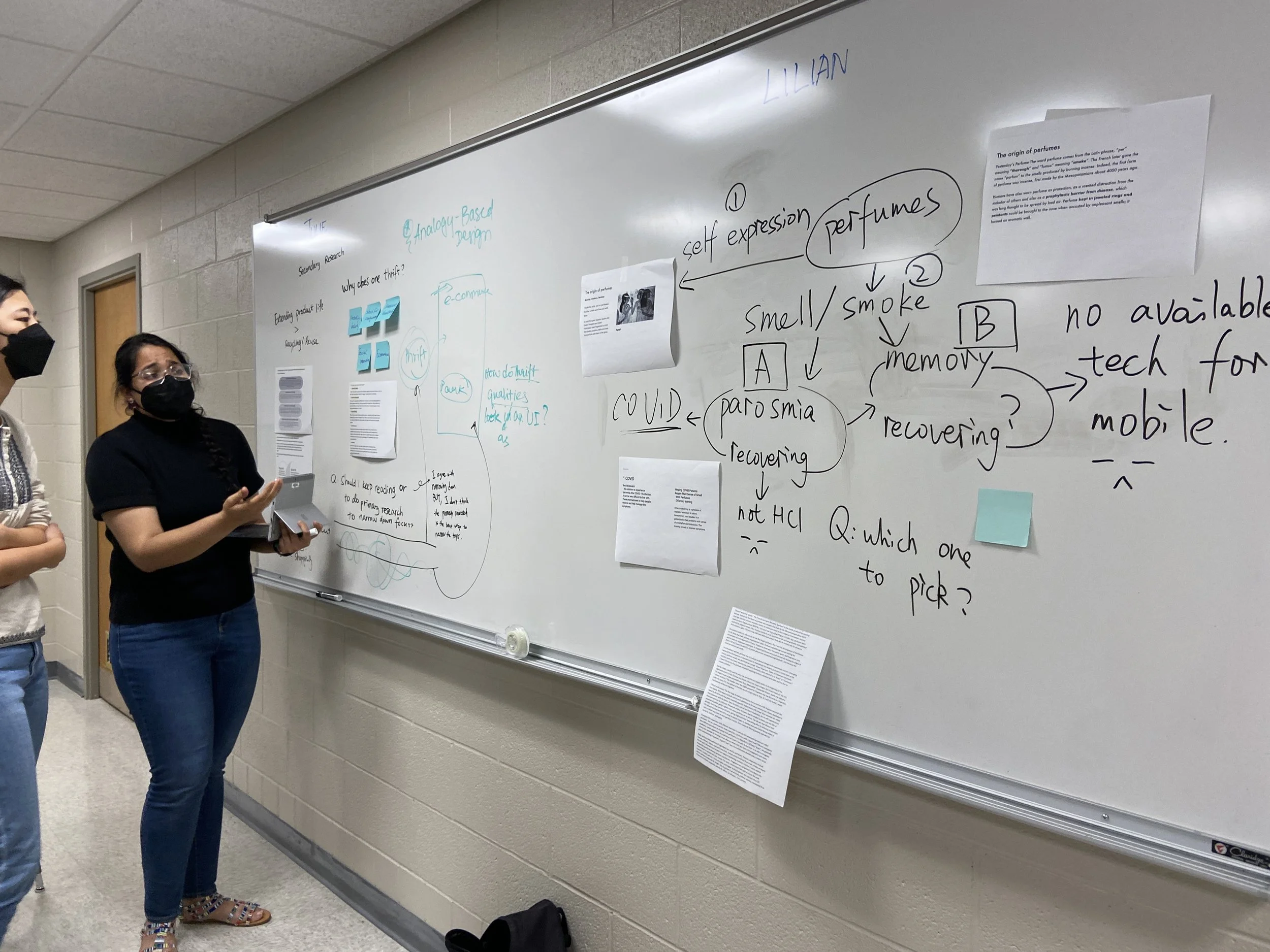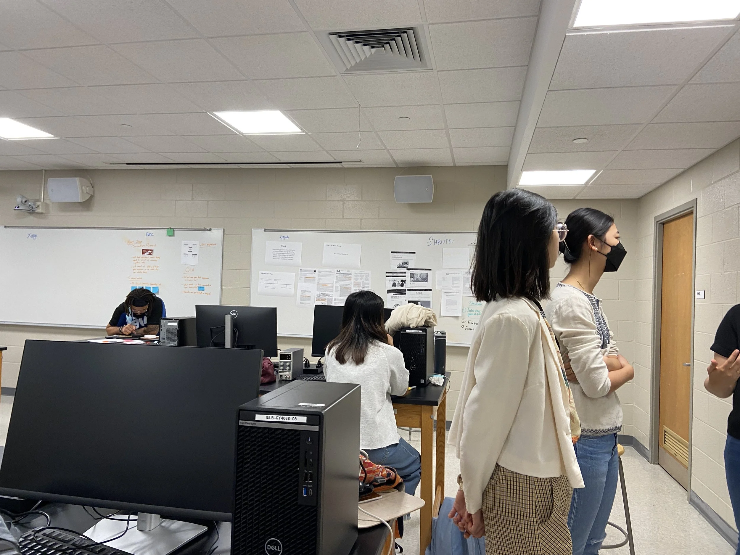 We used the gallery walk method to encourage students to discuss their work with their classmates, present the resources they have found that are relevant to their project, and brainstorm to help others out by answering questions others have. This method also allowed people to efficiently gather feedback from others, and learn to give helpful feedback for their peers. Through this method, each student had 80 mins of class time to get feedback from the two instructors (Shruthi and Ariel) as well as 26 other peers; which maximized their weekly feedback time for the class. This is also added with 5 hours of office hours provided by the instructors during the week.