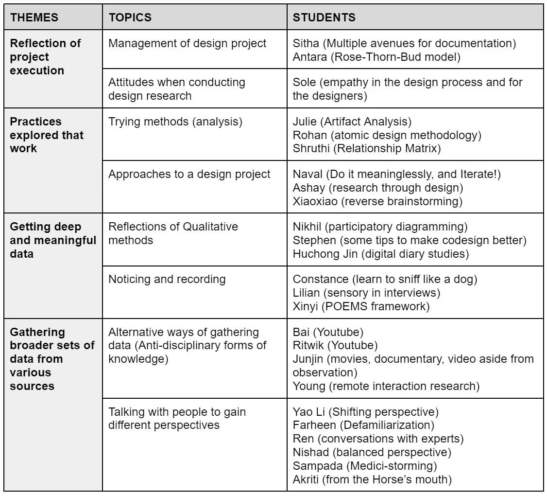 Structure of the Course | Learning Contract? | Gallery Walks | Instructor Emotions | Range of Projects | Guest Lecture: Jenny El-Shamy | Desk Critique, Meh!? | Design Documentation Guidelines and Tips | Lecture: Design Framing- Shruthi Chivukula | One-thing Presentations | One-Q Gallery Walk | What to do for Final Showcase?