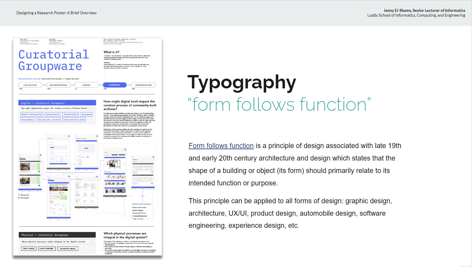 Week 5 started with an invited talk from Jenny El-Shamy, Senior Lecturer of Informatics, about designing a HCI/d research poster; aligning with the research-focused outputs a lot of students might produce by the end of the Fall Semester.